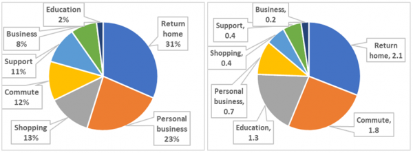 By purpose – Trips to support others have increased from 2 to 3 a week. Shopping trips have increased from 3 to 4 a week. Trips for social or personal business are down from 6 a week to 5. The average numbers of trips to work and education are essentially unchanged, at 3 and 1 respectively.