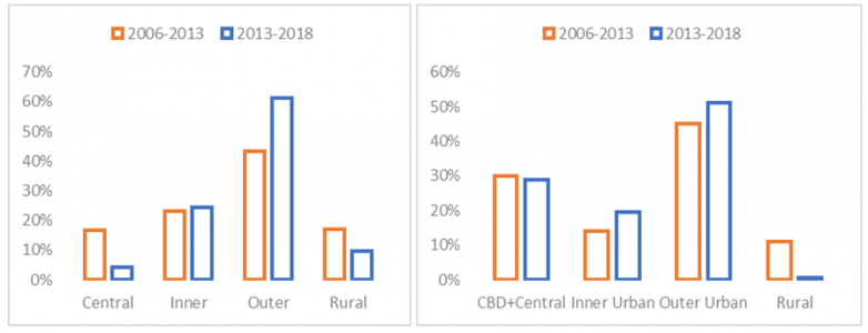 This distribution is likely to reflect the lower land costs and relative ease of access in outer parts of the Auckland urban area for individual household and firms. While households and firms may be further apart in outer parts of the urban area, housing costs are lower, and households are able to access suitable jobs and services in less time.